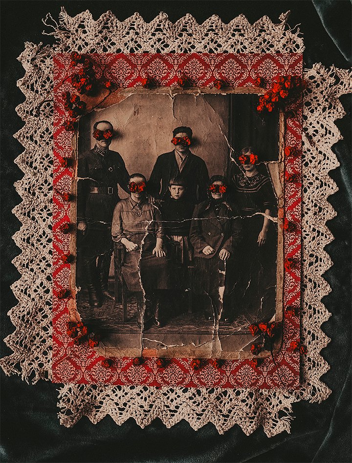«Получилась личная интерпретация семейной истории. Лица скрыты метафорически, поскольку этих членов семьи я никогда не видела. Это мой способ сказать, что я чувствую их присутствие, но при этом они остались для меня загадкой, частью большого прошлого. И лишь лицо моей бабушки на этом снимке можно рассмотреть. Она — тот человек, который является живым мостом, соединяющим поколения», — объясняет свой замысел фотограф.