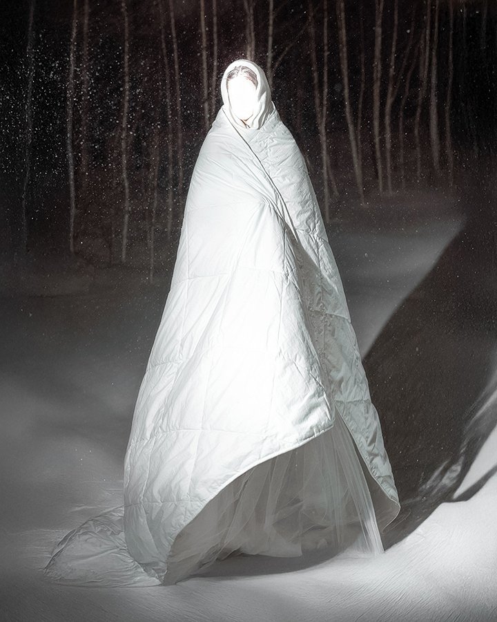 «Корректировки внесла погода: день был ясным и теплым, но к вечеру поднялась метель, модель замерзла, и мне пришлось вынести из дома теплое одеяло, чтобы ее согреть. И вот так она стояла, укутавшись, в свете фонаря. Этот образ переосмысливает Снегурочку через современный визуальный язык, соединяя фольклор и эстетику нашего времени. На границе света и тени возникает хрупкий, но крепко стоящий на земле, почти сакральный образ зимней сказки — прекрасной, далекой и мимолетной», — говорит фотограф Инна Пономарева.