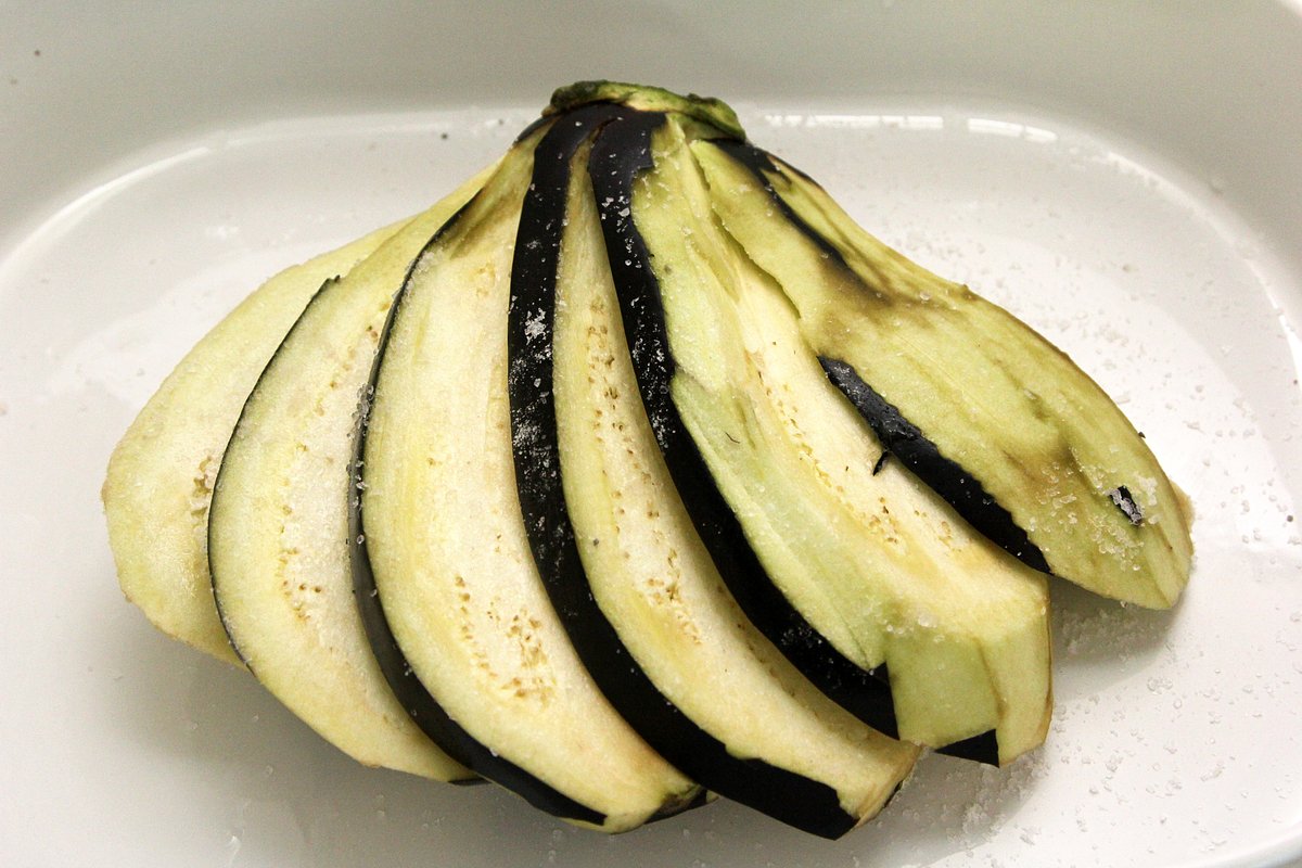 - Нарежьте баклажаны и обработайте ломтики для удаления горечи.