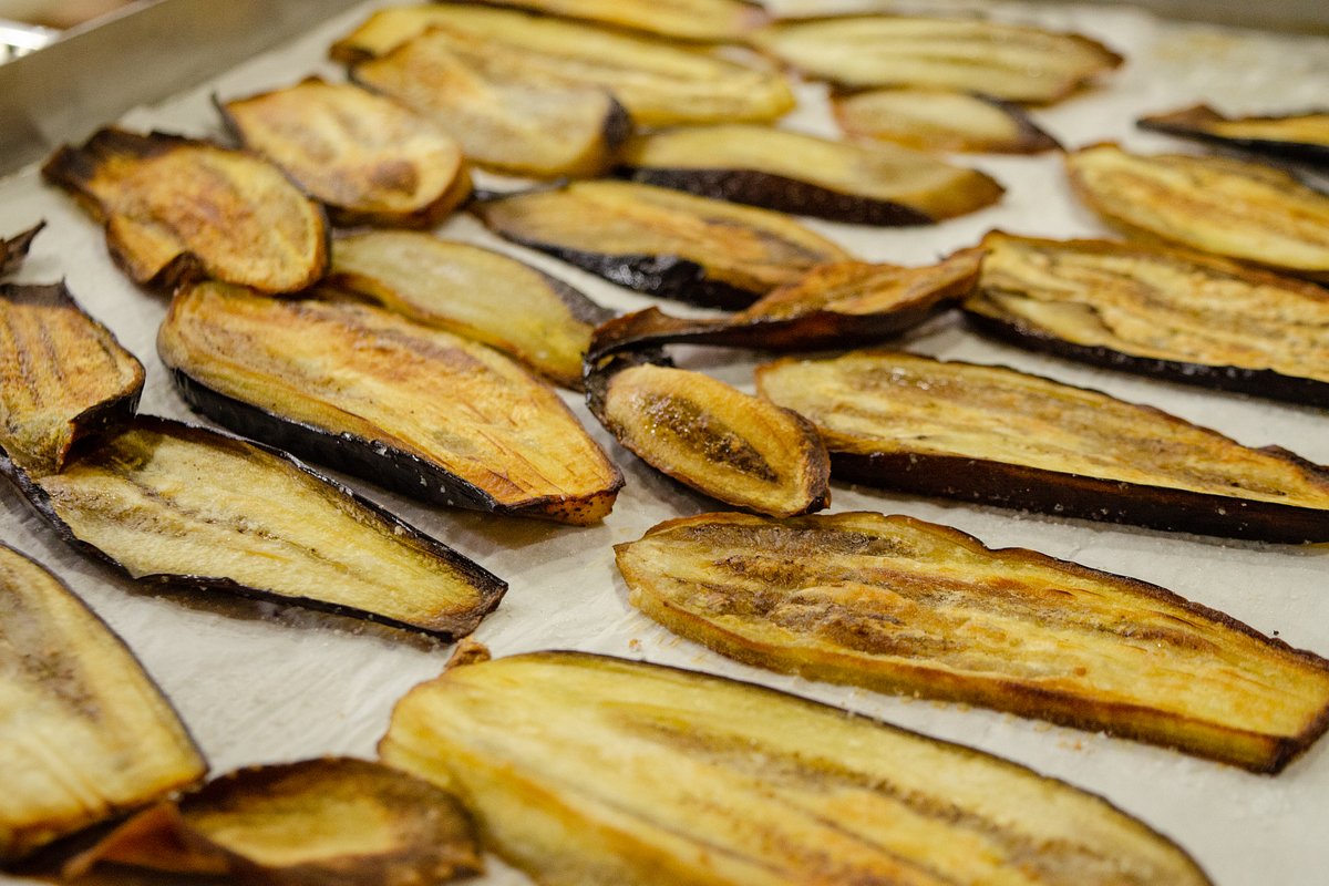 - Запекайте ломтики баклажана 15–20 минут при 200 градусах до легкого подрумянивания.