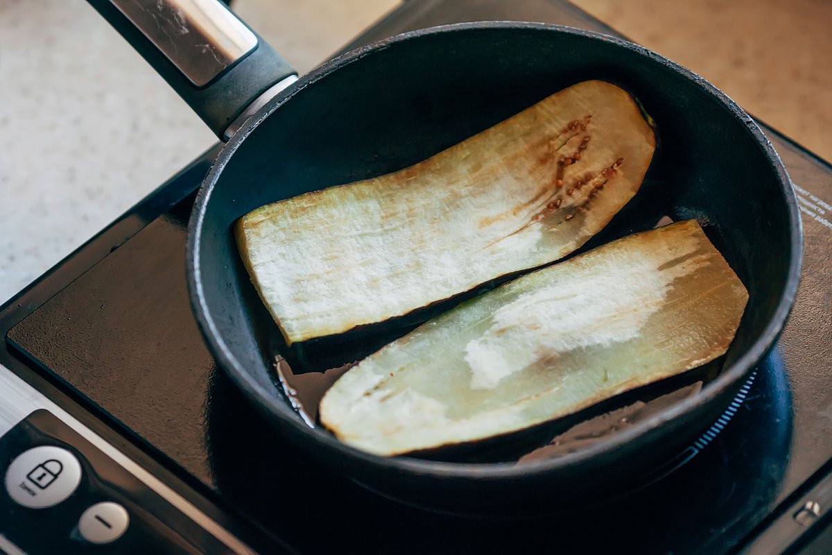 - Обжарьте каждый кусочек баклажана по 2–3 минуты с двух сторон до золотистой корочки.
