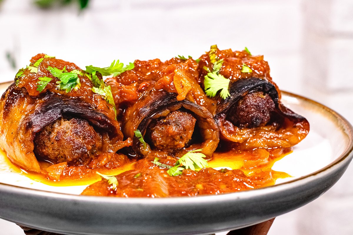Рулетики из баклажанов с мясной начинкой и томатным соусом