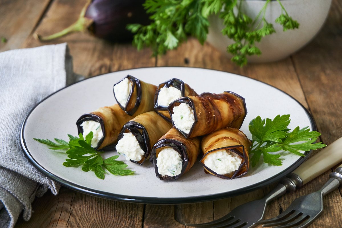 Лучше всего подходят для рулетиков крупные, плотные и ровные баклажаны — их просто резать, а ломтики удобно сворачивать, они не разваливаются при готовке.