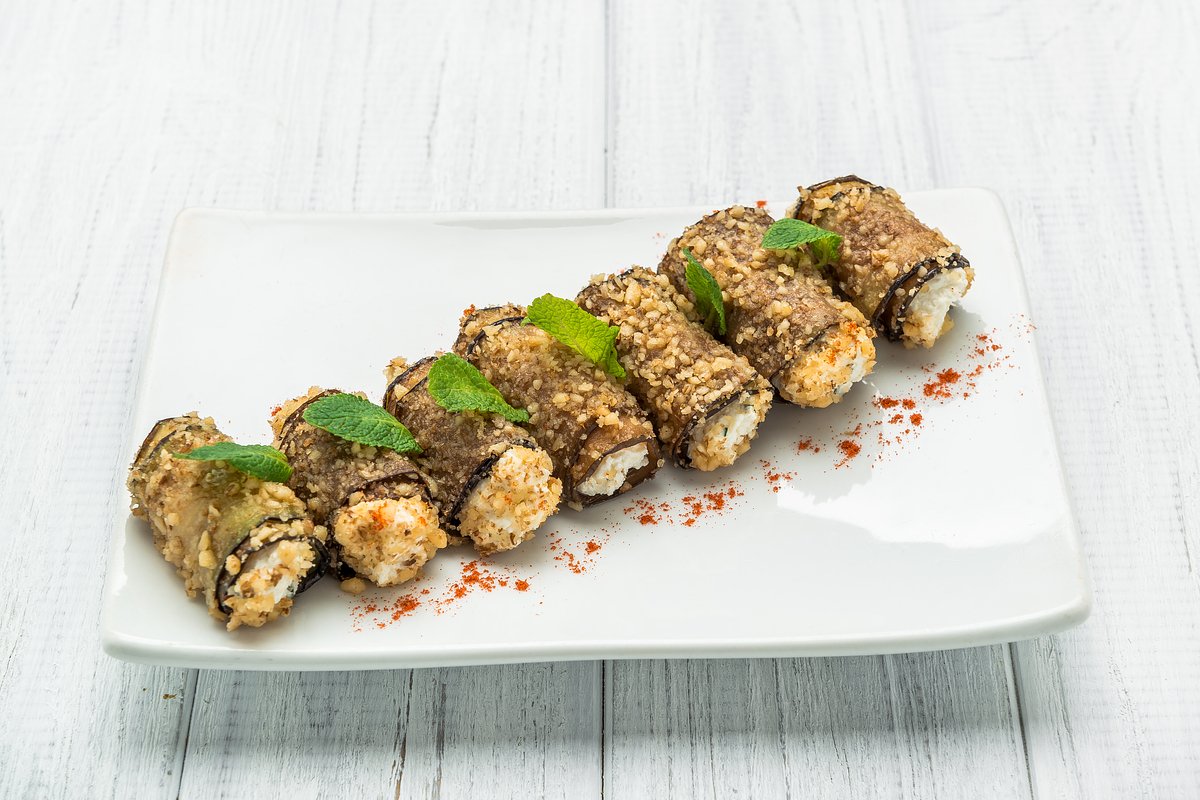 Рулетики из баклажанов в панировке с сыром и чесноком