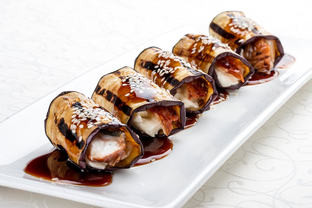 Рулетики из баклажанов с томатно‑ореховой начинкой